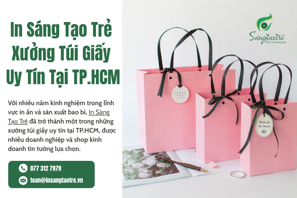 Ngày nay, túi giấy đã trở thành lựa chọn phổ biến của nhiều doanh nghiệp, cửa hàng thời trang, mỹ phẩm, tiệm bánh và quà tặng tại TP.HCM. Không chỉ giúp bảo vệ môi trường, túi giấy còn là công cụ quảng bá thương hiệu tinh tế, tăng trải nghiệm khách hàng. Nếu bạn đang tìm một địa chỉ uy tín, có sẵn túi giấy và đa dạng mẫu mã tại TP.HCM, In Sáng Tạo Trẻ chính là giải pháp hoàn hảo.